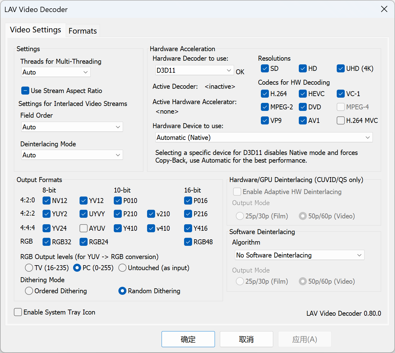 在 PotPlayer 中双击进入 LAV Video Decoder 的设置界面,找到右上角的 Hardware Decoder to use(使用的硬件解码器),这里的选项绝不能选 DXVA2 (native) 或 None,必须选择: D3D11,在下方的 Active Decoder 中,确保勾选了 HEVC 和 10bit。点击确定保存。