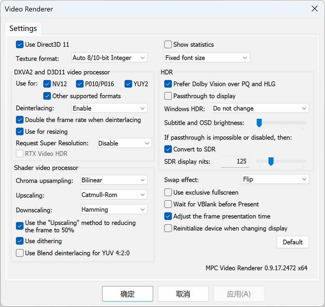 PotPlayer 自带的默认渲染器对杜比视界(特别是 Profile 5)的支持不完善,会导致颜色映射错误(呈现紫色或绿色)。MPC Video Renderer 是一款免费的开源渲染器,能够正确识别杜比视界元数据,并将其正确处理(直通给支持的显示器,或映射为正常的 SDR 颜色)。